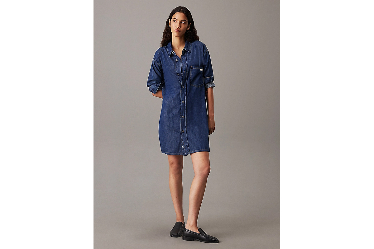 Ανακάλυψε την ιδανική ισορροπία ανάμεσα στο casual denim και την κομψότητα με το Calvin Klein γυναικείο τζιν φόρεμα πουκαμίσα με ζώνη σε μπλε χρώμα.