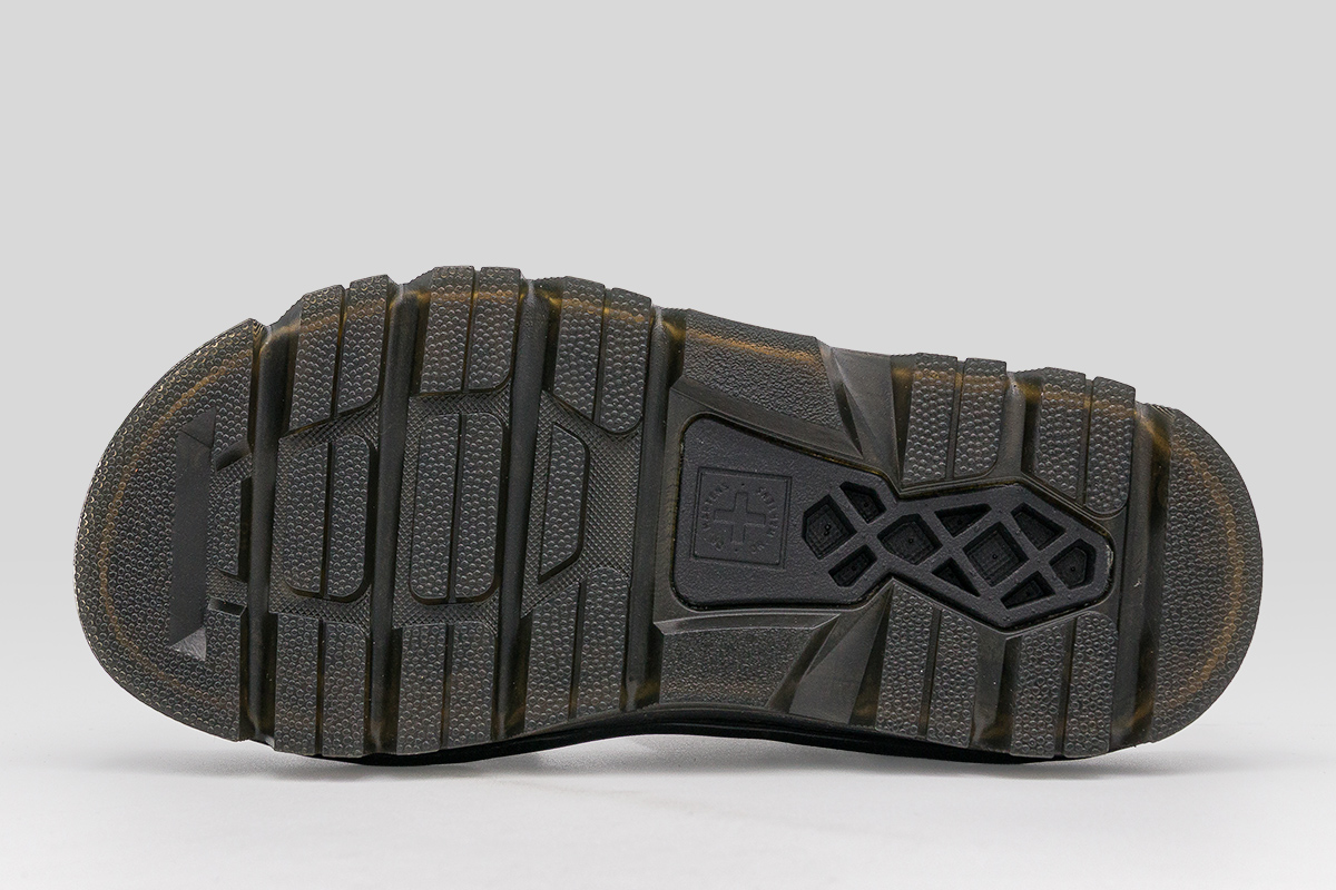 Η μαύρη και γκρι σόλα και οι χαρακτηριστικές κίτρινες ραφές ολοκληρώνουν το εμβληματικό Dr. Martens look.