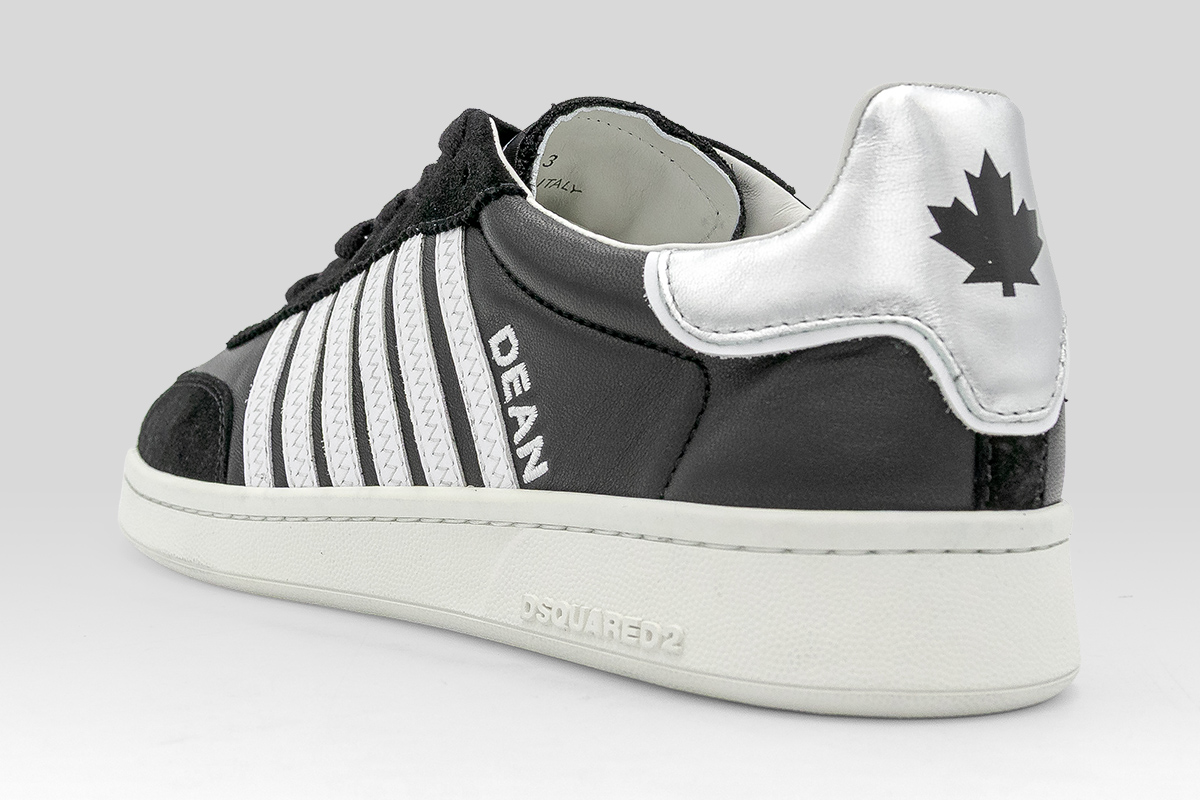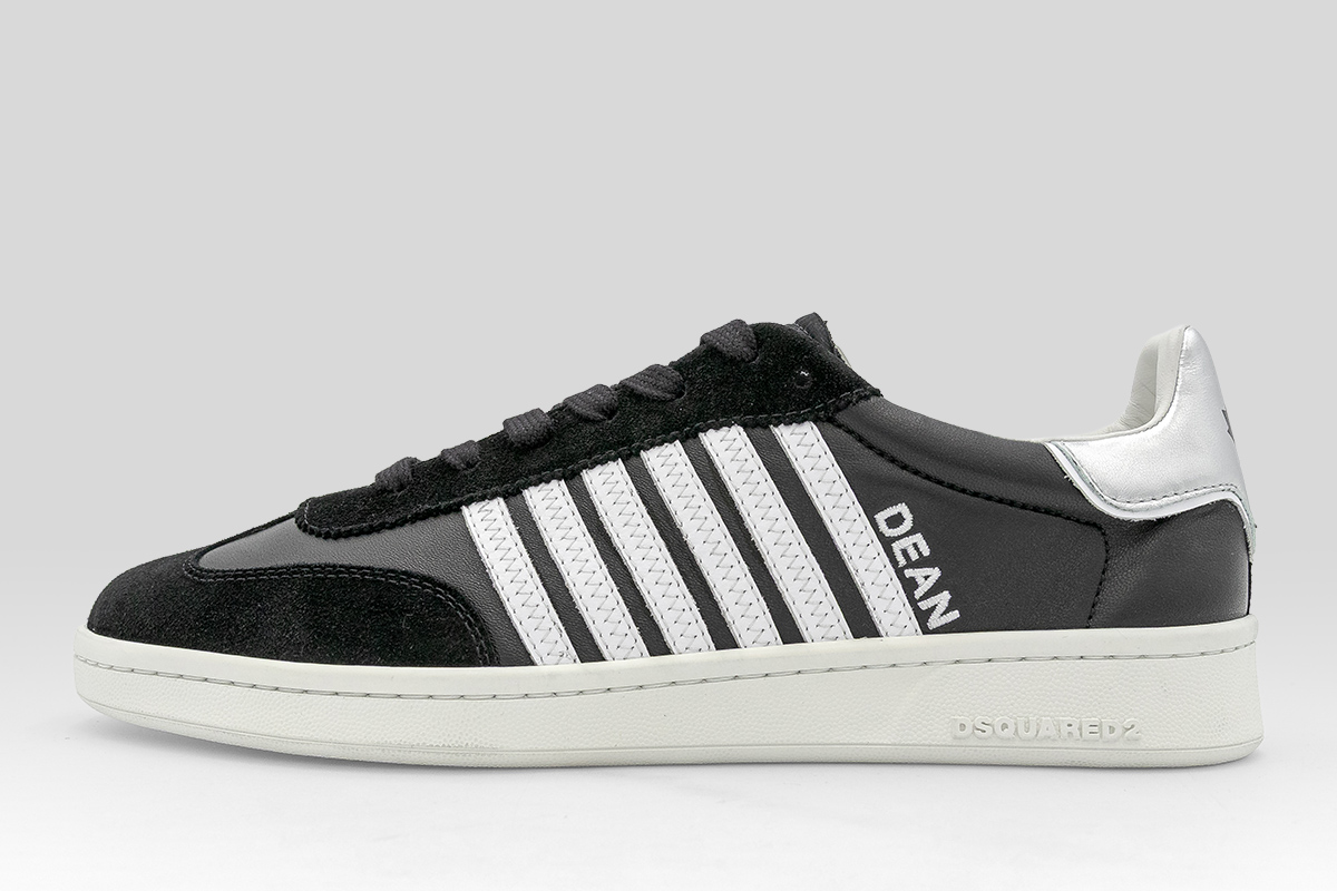 Η αντίθεση της επίπεδης σόλας δίνει μοντέρνο look, ενώ οι χαρακτηριστικές λοξές ταινίες στα πλαϊνά και η εμβληματική υπογραφή Dsquared2 στο εξωτερικό πάνελ αναδεικνύουν τη μοναδική ταυτότητα του brand.