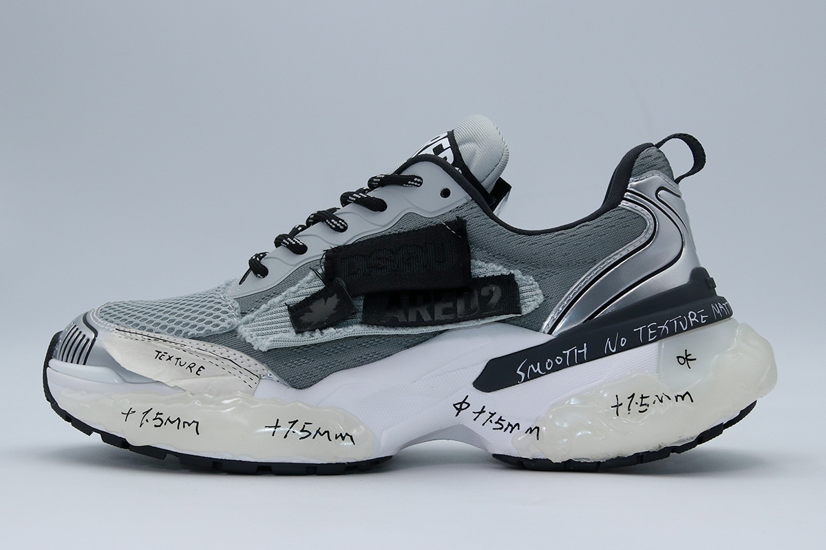 Η χοντρή, αποσυναρμολογημένη σόλα δημιουργεί εντυπωσιακό όγκο και προσφέρει άνεση σε κάθε βήμα, ενώ τα scribbled κείμενα στη σόλα και τα σκισμένα λογότυπα στις πλευρές χαρίζουν μοναδικό χαρακτήρα.