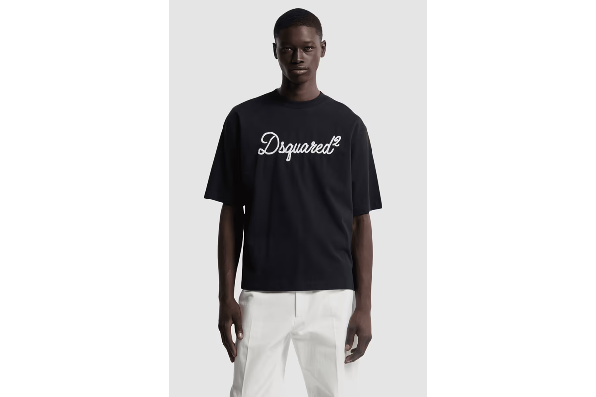 Το έντονο λευκό λογότυπο Dsquared2 στο στήθος ξεχωρίζει πάνω στο καθαρό μαύρο φόντο, προσδίδοντας μια διακριτική, αλλά εντυπωσιακή λεπτομέρεια.