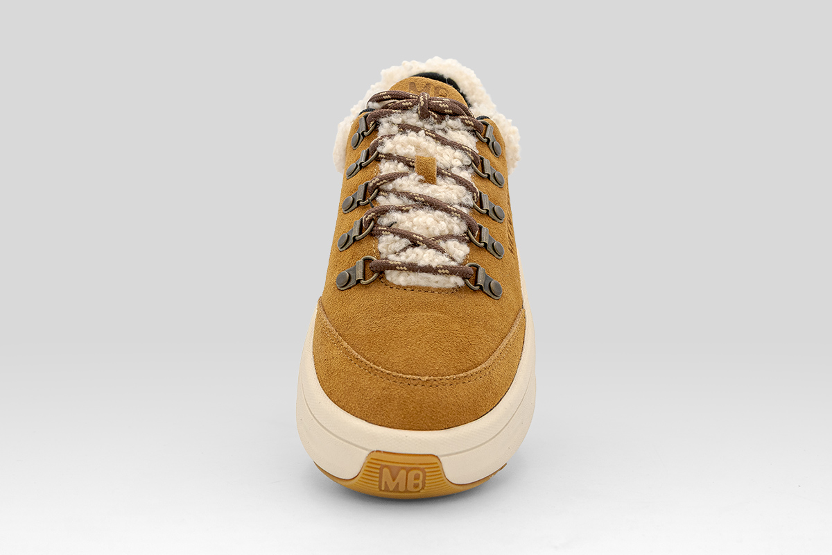 Το καφέ σουέτδέρμα συνδυάζεται αρμονικά με τη βελούδινη κρεμ επένδυση shearling στη γλώσσα και στο κολάρο, δημιουργώντας μια αίσθηση πολυτέλειας και ζεστασιάς.