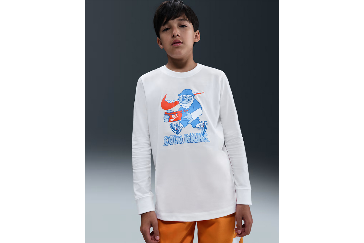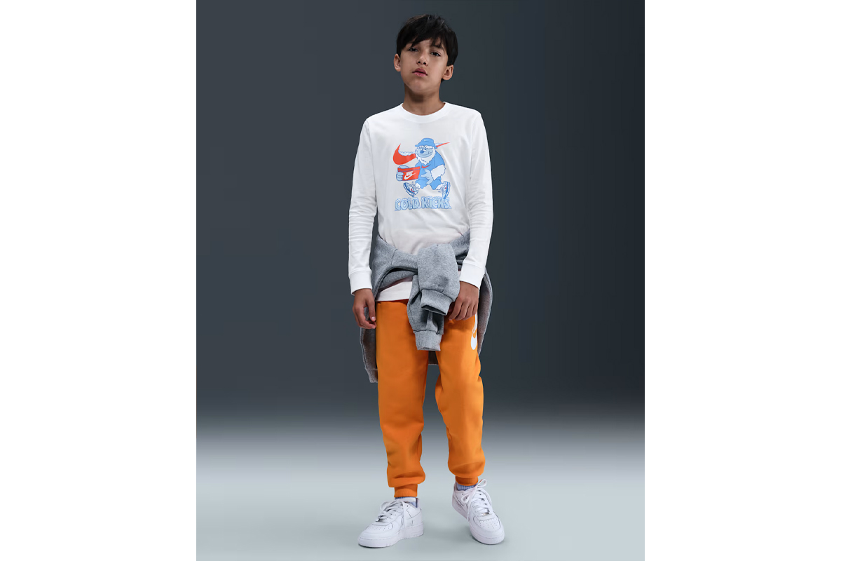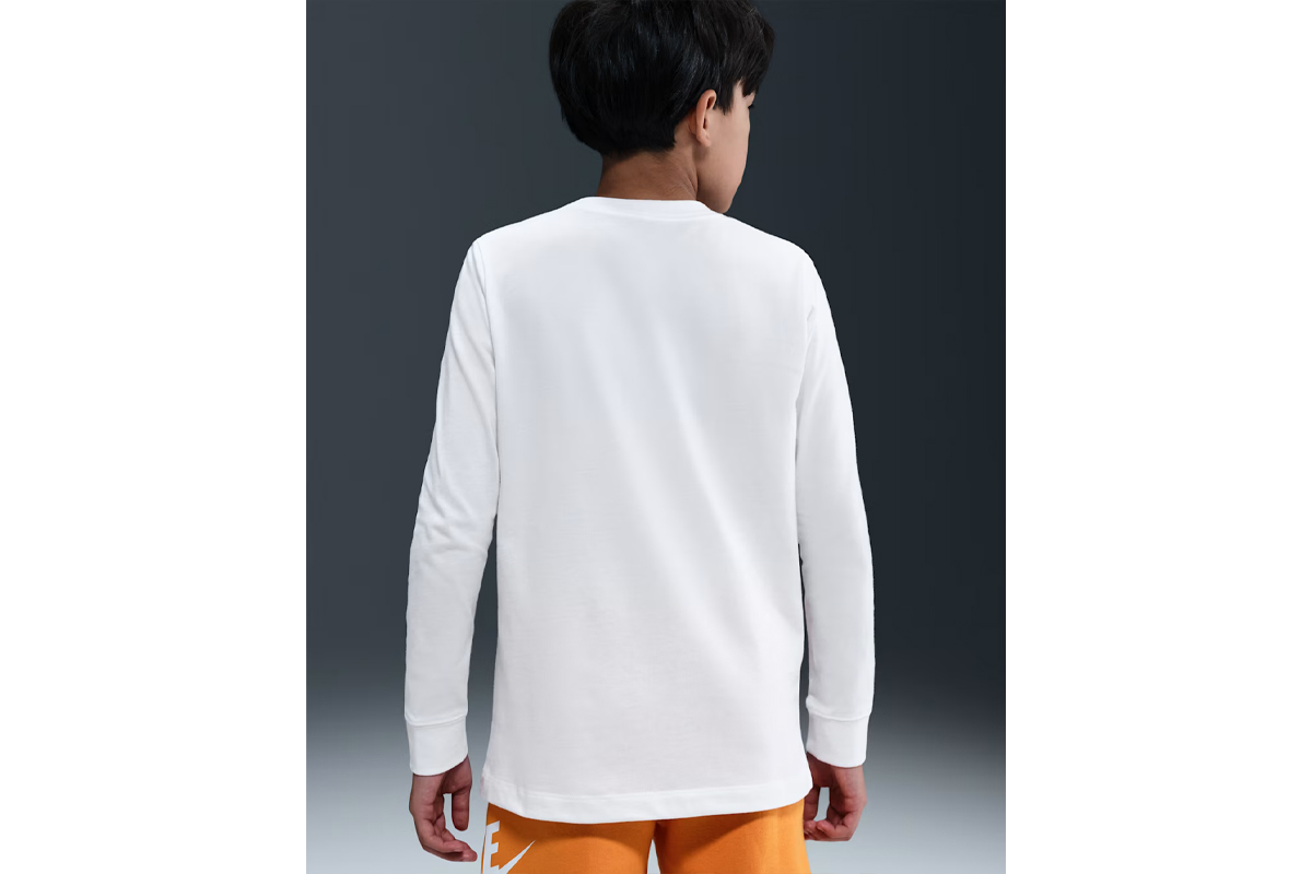Δώσε στο καθημερινό σου look άνεση και χρώμα με τη Nike Sportswear παιδική μακρυμάνικη μπλούζα με λαιμόκοψη σε λευκό, μπλε και πορτοκαλί χρώμα.