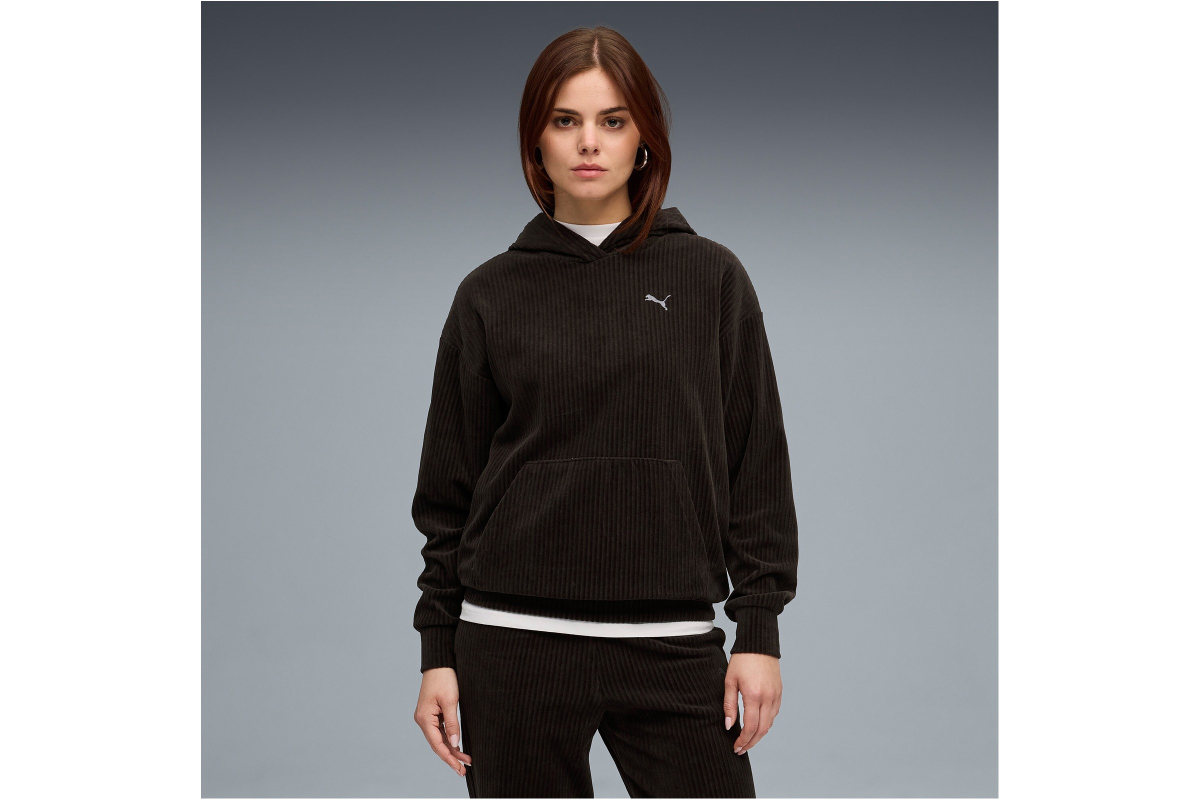 Απόλαυσε την τέλεια ισορροπία ανάμεσα στην άνεση και το στυλ με το Puma Essentials Elevated Comfort Velour Rib γυναικείο φούτερ με κουκούλασε μαύρο χρώμα.